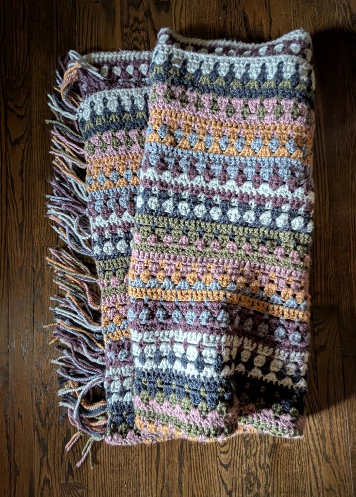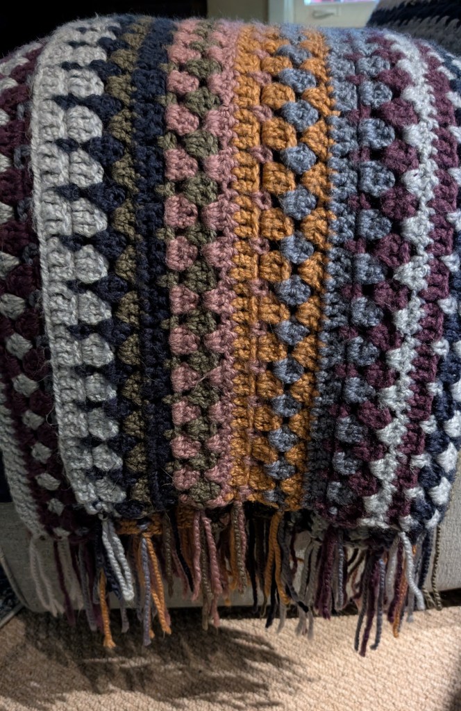 The pattern worked up beautifully, and I was able to finish the entire blanket in under two weeks. In total, it took just 13 hours to complete! Now I’ve got a new fall/winter staple that’s ready to keep me warm during those crisp evenings. There’s nothing quite like wrapping yourself in something handmade, especially when it’s crafted with comfort and care.